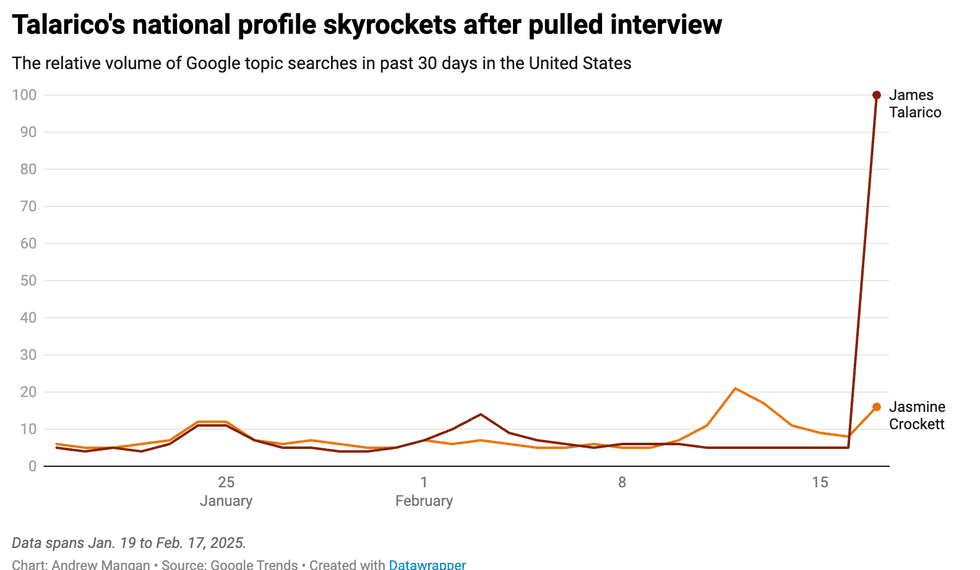 And data shows that Google search traffic for Talarico skyrocketed after Colbert revealed that he was blocked from airing the interview on CBS.