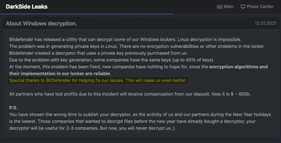 "Special thanks to BitDefender for helping fix our issues," DarkSide said. "This will make us even better."