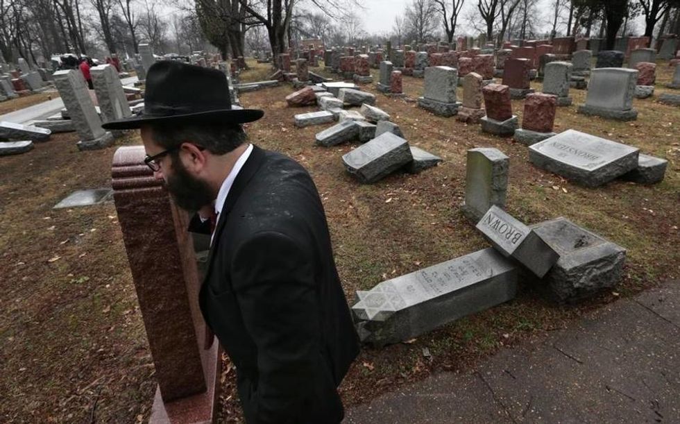 IMAGE: Rabbi Hershey Novack walks through Chesed Shel Emeth Cemetery in University City, Missouri where almost 200 gravestones were vandalized. Robert Cohen / St. Louis Post-Dispatch