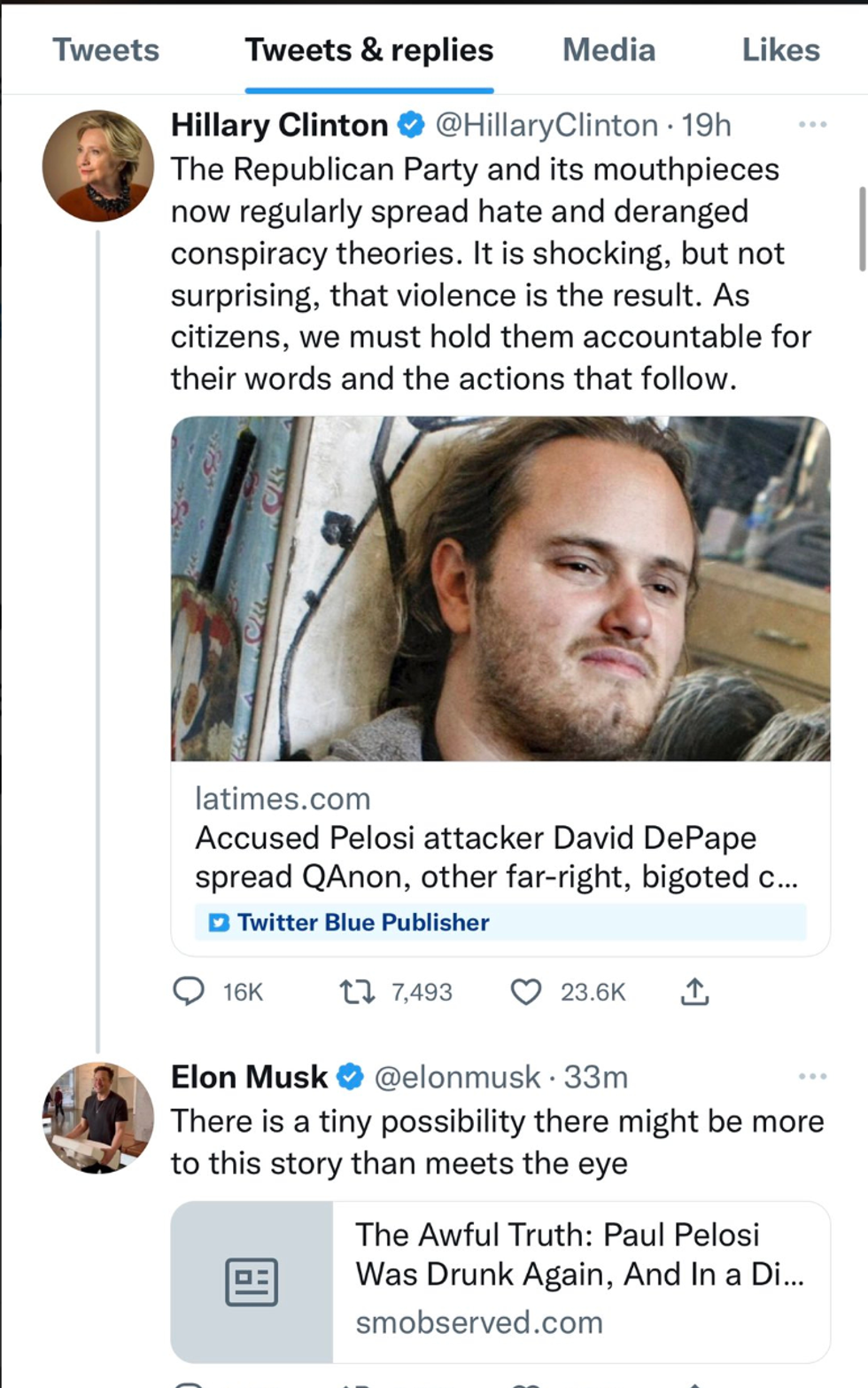 Musk was responding to a tweet by Hillary Clinton about the assailant, David DePape, who was being described by San Francisco police as a well-known spreader of racist and far-right conspiracy theories. Here is the vile headline for the story Musk tweeted a link to: