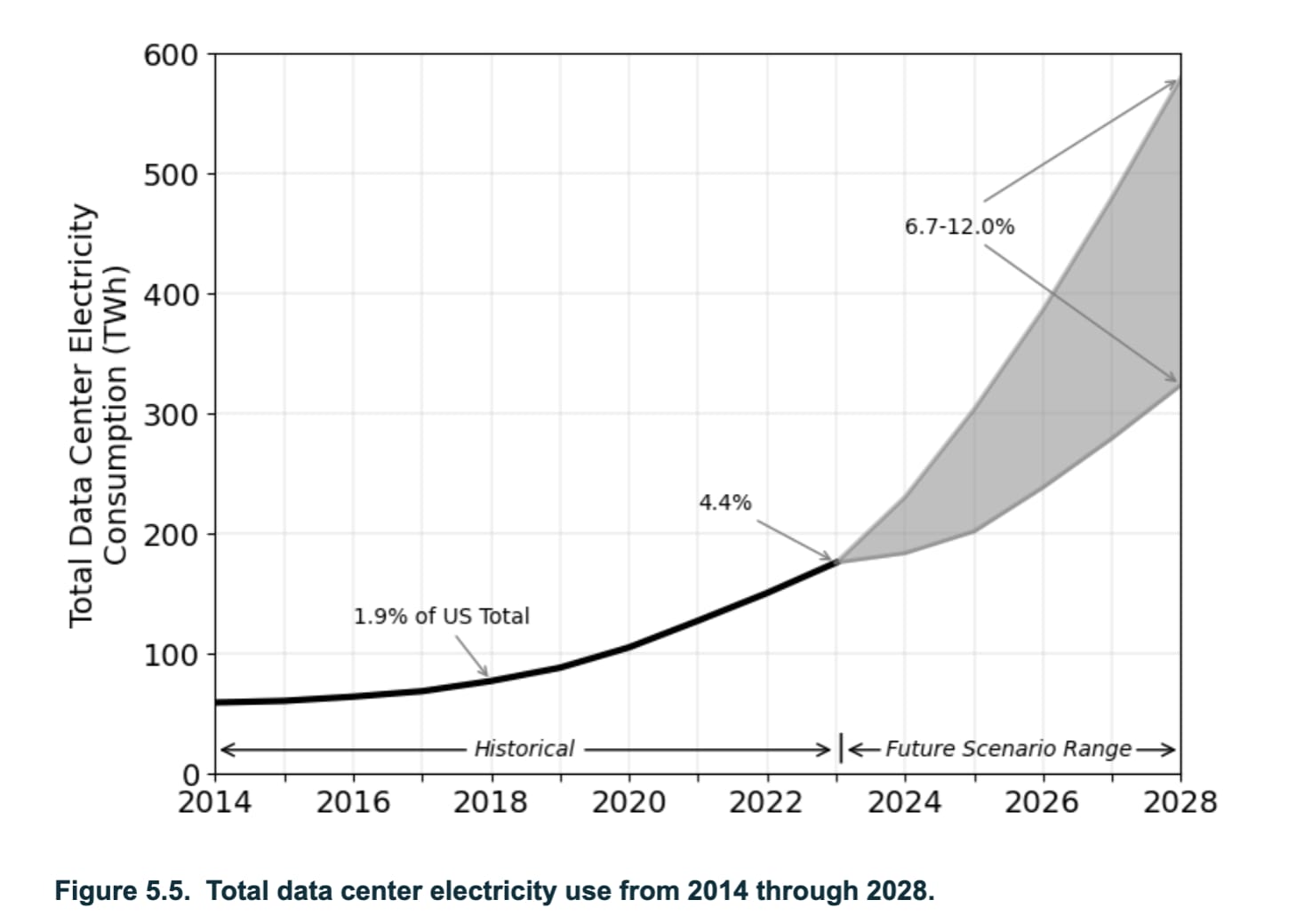 How much generating capacity are we talking about? The Department of Energy estimates that data centers already consumed 4.4 percent of U.S. electricity in 2023, and expects that to grow to as much as 12 percent by 2028: