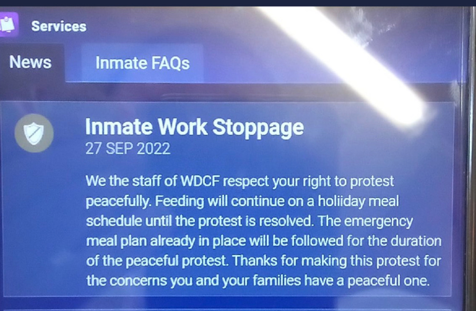 Upon hearing of the strike, administrators posted a notice to inmates at William Donaldson Correctional Facility in Bessemer, Alabama that houses 1362 men.“Feeding will continue on a holiday meal schedule until the protest is resolved. The emergency meal plan already in place will be followed for the duration of the peaceful protest, Thanks for making this protest for the concerns you and your families have a peaceful one (sic).”