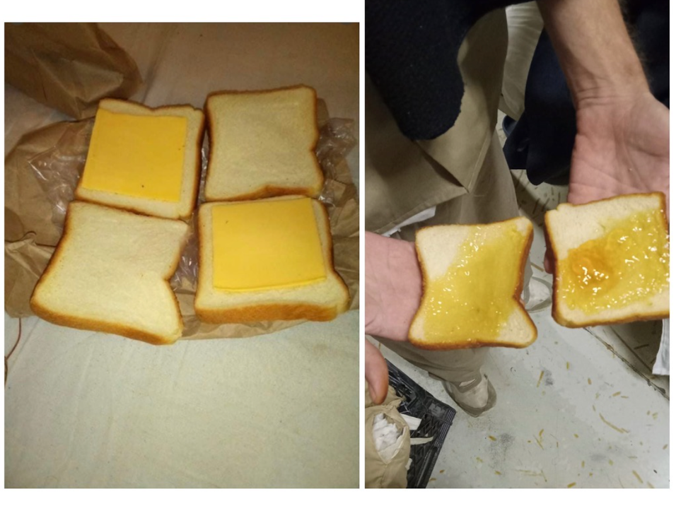 Another meal is two peanut butter and jelly sandwiches (peanut butter and jelly are mixed so that the jelly can’t be used to make alcohol).