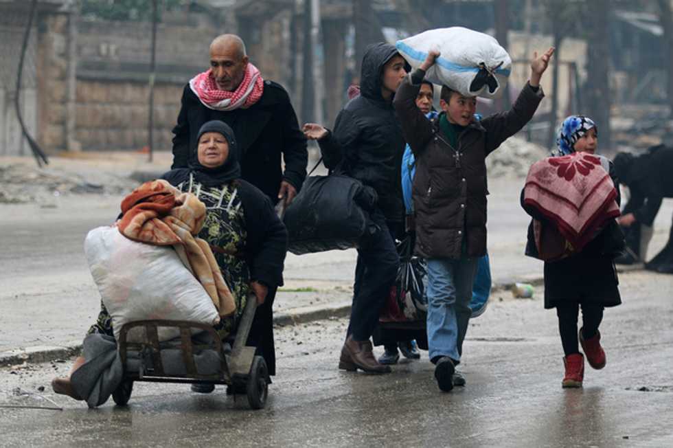 IMAGE: A man pushes a woman on a cart as they flee deeper with others into the remaining rebel-held areas of Aleppo, Syria. REUTERS/Abdalrhman Ismail