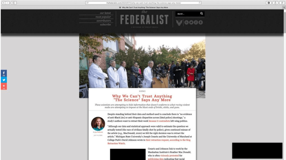 On July 10, The Federalist ran an article titled "Why We Can't Trust Anything 'The Science' Says Any More." While the article's text did not mention Fauci by name, it prominently displayed a photo of him at the top of the piece: