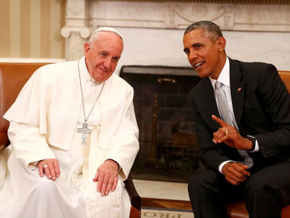 Photo: U.S. President Barack Obama sits with Pope Francis (L) in the Oval Office as the pontiff is welcomed to the White House during a ceremony in Washington September 23, 2015. REUTERS/Tony Gentile