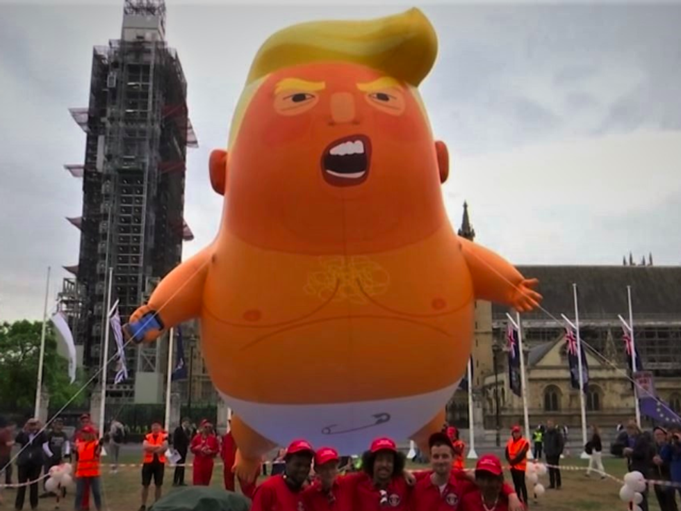 The “blimp,” which is more accurately a very large balloon like those flown in parades, portrays Trump in a diaper with a “scowling, splotchy face of a giant orange baby,” according to the Post.