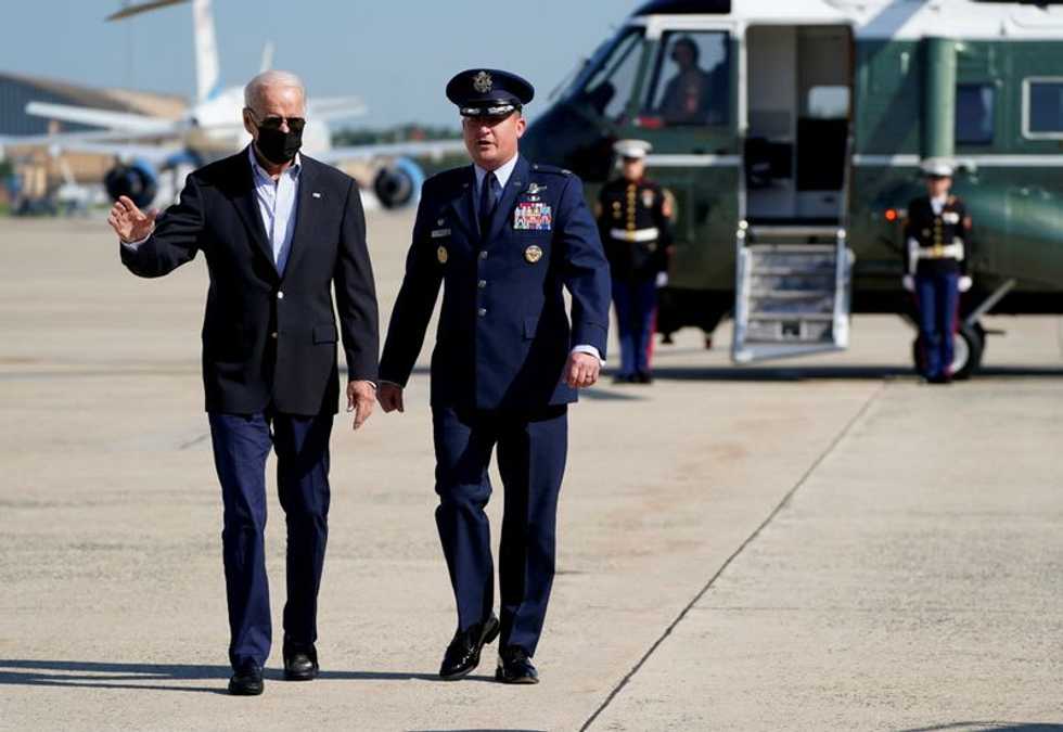 President Joe Biden walks with Col. Matthew E. Jones, before departing Joint Base Andrews to visit hurricane-ravaged New York and New Jersey