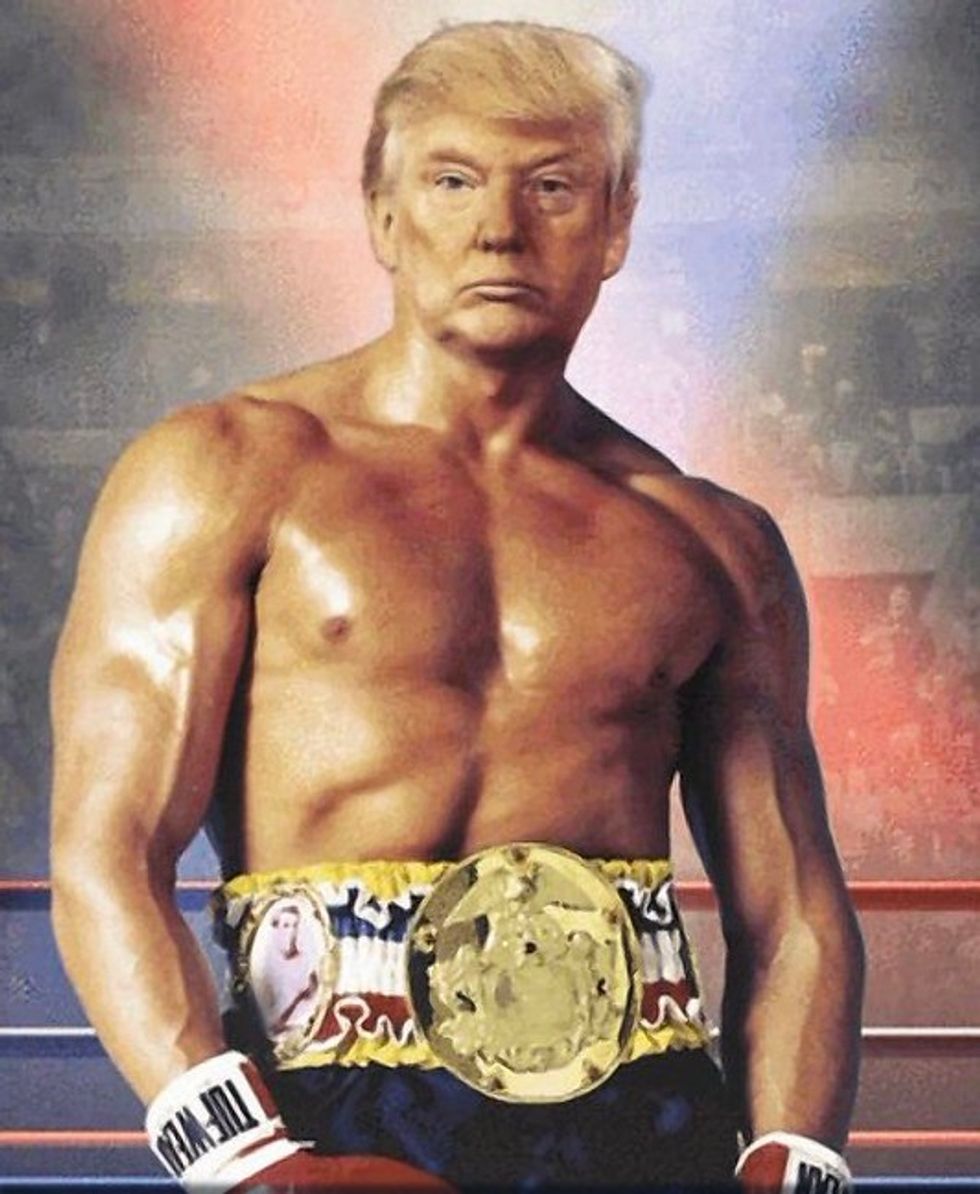 Read up some time about how young Sylvester Stallone worked to develop his impressive physique. Few actual heavyweight champs have ever trained harder. Trump, meanwhile, can barely hump it from golf cart to green. His idea of a fitness regimen is elevator shoes and a girdle.