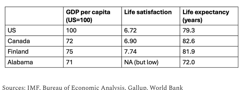 So yes, Canada’s GDP per capita is comparable to that of very poor U.S. states. So is per capita GDP in Finland, generally considered the world’s happiest nation. But Canadians appear, on average, to be more satisfied with their lives than we are, although not at Nordic levels. We don’t have a comparable number for Alabama, but surveys consistently show it as one of our least happy states.