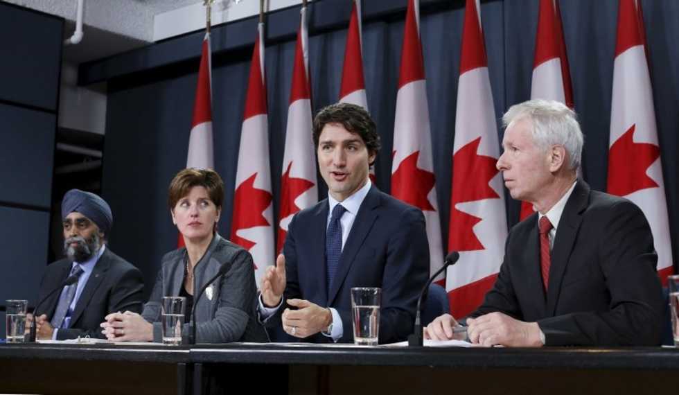 Photo: Canada’s Prime Minister Justin Trudeau (2nd R) speaks during a news conference with Defence Minister Harjit Sajjan (L), International Development Minister Marie-Claude Bibeau (2nd L) and Foreign Minister Stephane Dion in Ottawa, Canada, February 8, 2016. REUTERS/Chris Wattie