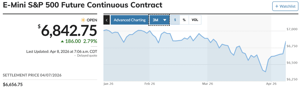 —The Way We Were: Will Markets/Oil Just Revert to Prewar Levels/Trends? Unknowable, but, at least re oil, not if the aforementioned premium kicks in. Equity markets, though they trended down toward correction territory, broadly expected Trump to back down, so the relief rally is solidly underway as I write this AM: Here’s the S&P pre-opening futures: