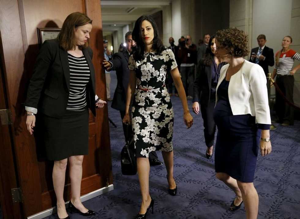 Photo: Huma Abedin (C), longtime aide to U.S. Democratic presidential candidate Hillary Clinton, enters the room to meet with the House Select Committee on Benghazi in the U.S. Capitol in Washington October 16, 2015. REUTERS/Kevin Lamarque