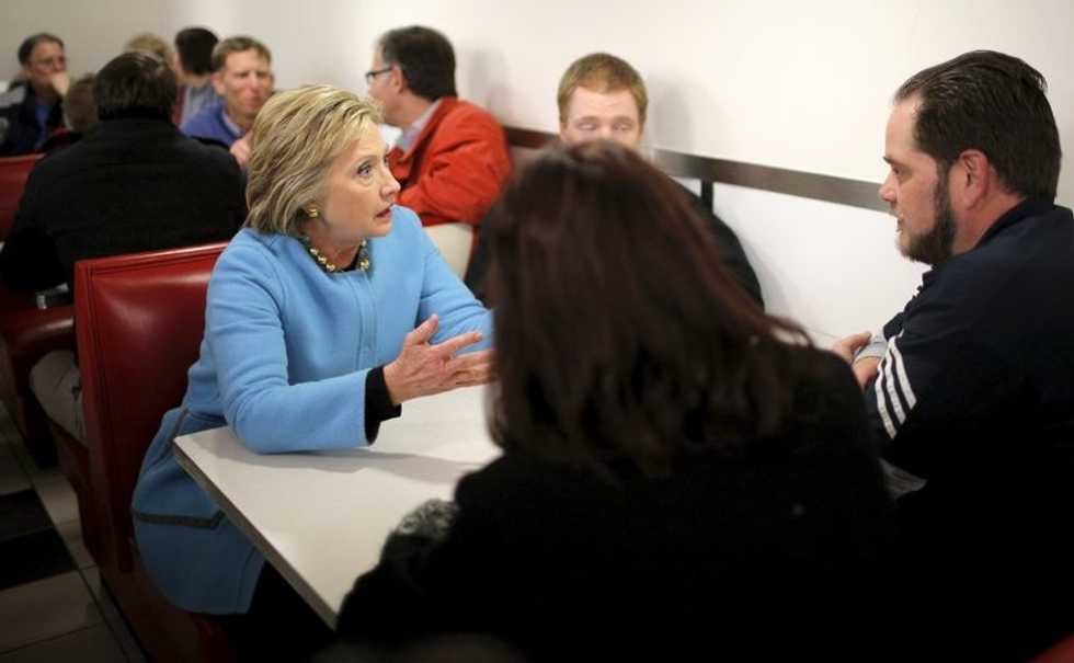 Photo: U.S. Democratic presidential candidate Hillary Clinton visits with employees during a campaign stop at Velcro Companies in Manchester, New Hampshire February 8, 2016. REUTERS/Brian Snyder