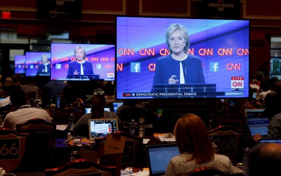 Photo: Journalists in the debate media filing center watch as Democratic U.S. presidential candidate Hillary Clinton speaks during the first official Democratic candidates debate of the 2016 presidential campaign in Las Vegas, Nevada October 13, 2015. REUTERS/Mike Blake
