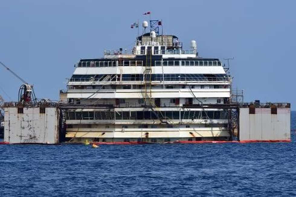 The 114,500-tonne vessel rose around two meters (over six feet) off the artificial platform on which it has rested since it was righted in September. It was then towed slightly away from the coastline for the re-floating to continue.