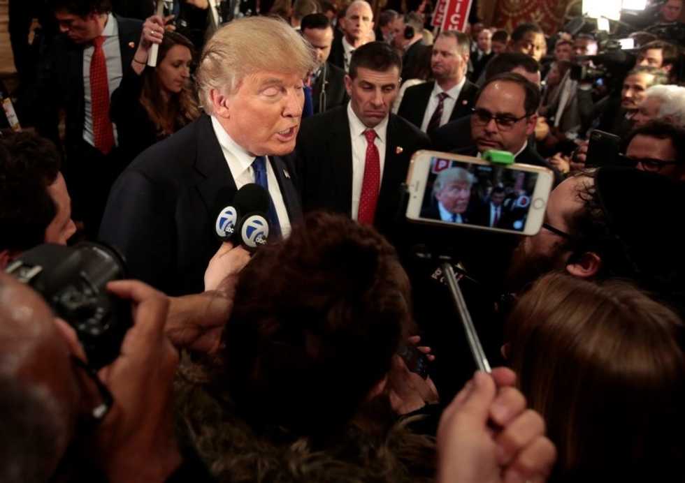 Photo: Republican U.S. presidential candidate Donald Trump speaks to the media in the spin room after the conclusion of the U.S. Republican presidential candidates debate in Detroit, Michigan, March 3, 2016. REUTERS/Rebecca Cook