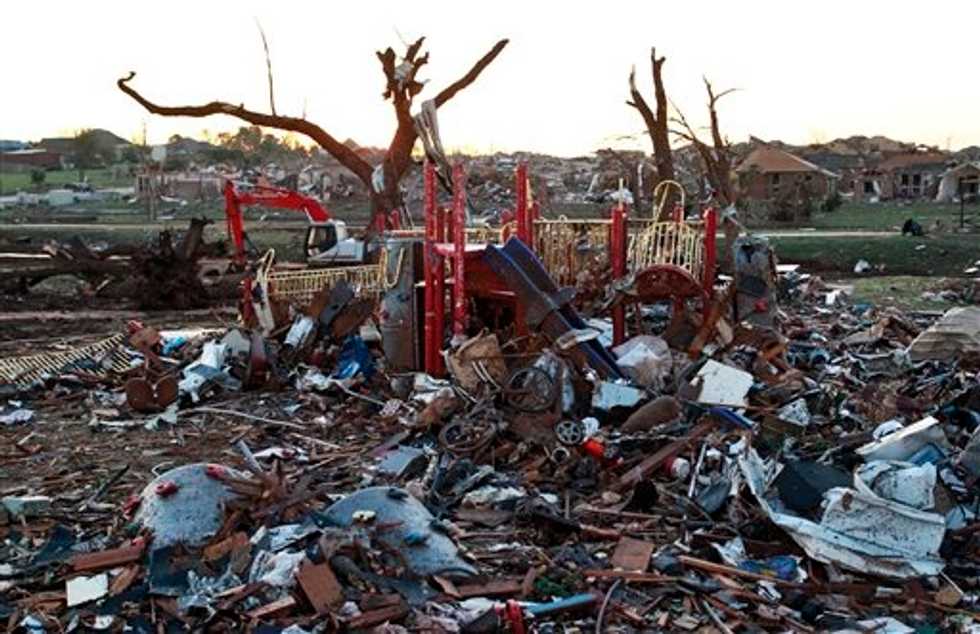 IMAGE: The wreckage of homes litters a playground adjacent to a neighborhood which was destroyed when a huge tornado roared through an Oklahoma City suburb, flattening a wide swath of homes and businesses. (AP Photo/Brennan Linsley)