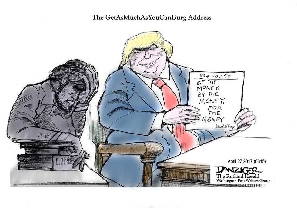 Jeff Danziger’s award-winning drawings are published by more than 600 newspapers and websites. He has been a cartoonist for the Rutland Herald, the New York Daily News and the Christian Science Monitor; his work has appeared in newspapers from theWall Street Journal to Le Monde and Izvestia. Represented by the Washington Post Writers Group, he is a recipient of the Herblock Prize and the Thomas Nast (Landau) Prize. He served in the US Army as a linguist and intelligence officer in Vietnam, where he was awarded the Bronze Star and the Air Medal. Danziger has published ten books of cartoons and a novel about the Vietnam War. He was born in New York City, and now lives in Manhattan and Vermont. A video of the artist at work can be viewed here.