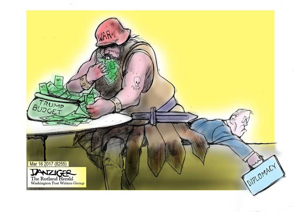 Jeff Danziger’s award-winning drawings are published by more than 600 newspapers and websites. He has been a cartoonist for the Rutland Herald, the New York Daily News and the Christian Science Monitor; his work has appeared in newspapers from the Wall Street Journal to Le Monde and Izvestia. Represented by the Washington Post Writers Group, he is a recipient of the Herblock Prize and the Thomas Nast (Landau) Prize. He served in the US Army as a linguist and intelligence officer in Vietnam, where he was awarded the Bronze Star and the Air Medal. Danziger has published ten books of cartoons and a novel about the Vietnam War. He was born in New York City, and now lives in Manhattan and Vermont. A video of the artist at work can be viewed here.