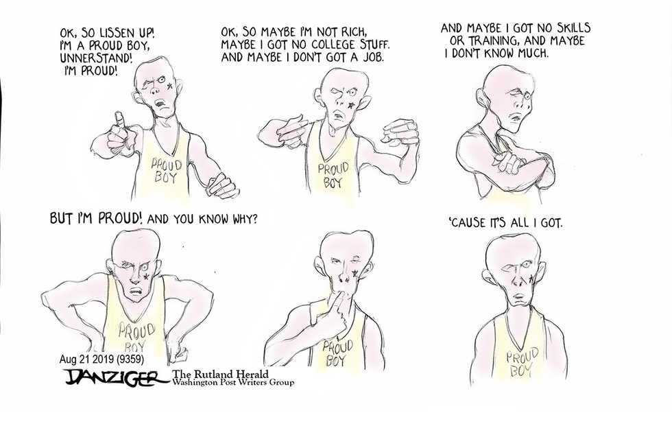 A fascist gang whose debating style relies on bats and brass knuckles, the “Proud Boys” pretend to defend “Western civilization.” (No thanks.)