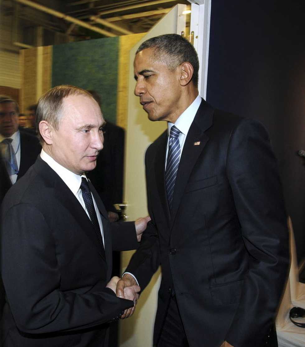 IMAGE: Russian President Vladimir Putin shakes hands with U.S. President Barack Obama at World Climate Change Conference 2015 in Le Bourget, near Paris/ REUTERS