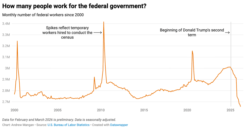 Due largely to the so-called Department of Government Efficiency, the federal workforce has shrunk by 352,000 jobs on net since January 2025, according to the U.S. Bureau of Labor Statistics. Surely, that saved us oodles? And soon the glorious efforts of Trump and former Shadow President Elon Musk, who ran DOGE, will trickle down and bless us all, right?