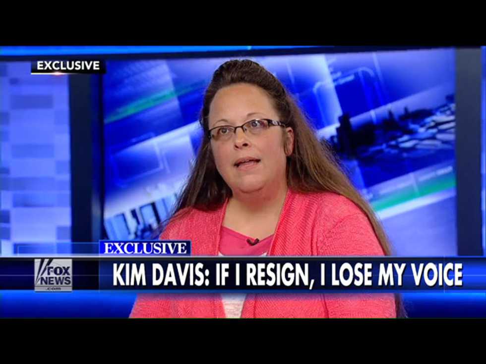 Kentucky county clerk Kim Davis is once again making the rounds on national media. The martyr of the anti-marriage-equality struggle has been explaining why she remains in office while fighting for her cause: “Why should I have to quit a job that I love, that I’m good at?”
