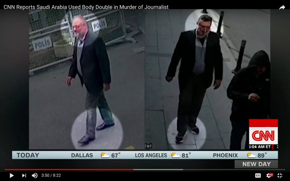 A new report from CNN early Monday utterly destroys the Saudi cover story for the killing of Jamal Khashoggi with video evidence. Among the members of the hit team from Riyadh was a “body double” for the journalist who strongly resembled him – and who apparently changed into Khashoggi’s clothes and left the consulate after the murder.