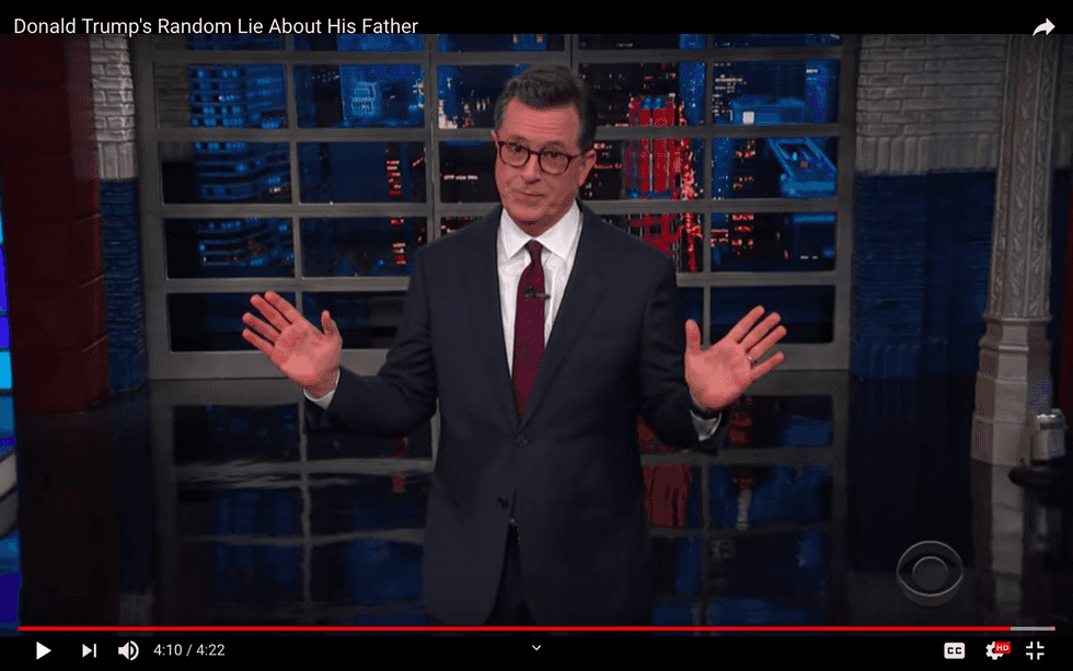 Colbert also notes the alarming brain fart when Trump repeatedly urged an investigation of “the oranges” of the Russia probe (perhaps meaning “origins”). This inspires a bonus knock-knock joke — orange who? — and a quick nod to a bizarre Trump lie concerning the “oranges” of his late father.