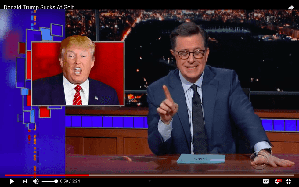 Stephen Colbert cites these and other astonishing facts from a new book by Rick Reilly, Commander-in-Cheat: How Golf Explains Trump, in which the former ESPN correspondent accuses the president of being an inveterate cheater who lies constantly about his game. Surprise!