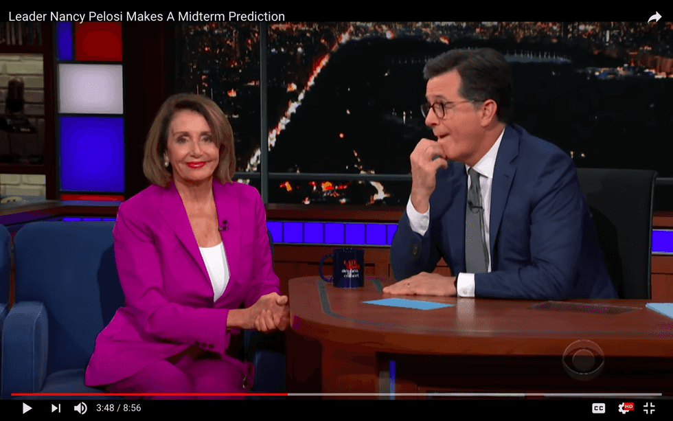 Watch Nancy Pelosi scare the hoo-ha out of Colbert when she flatly predicts a Democratic victory next Tuesday and “a great night for America.” Blanching at the “hex” laid on the midterm outcome by the minority leader, Stephen crosses himself, then offers to “sacrifice a goat” if necessary.