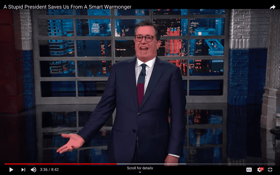 Colbert makes the most of this solemn event, with a side-splitting impression of Treasury Secretary Stephen Mnuchin as well as a reprise of the moment during a recent speech when “Trump’s brain spun out on a patch of mental ice.” Most hilarious is the new position he imagines for Bolton’s outrageous mustache, which is “staying on in the White House.”