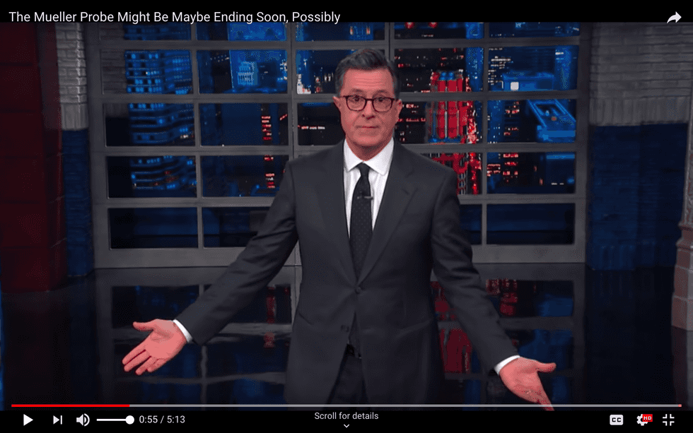 Is the Mueller investigation maybe, possibly, definitely — or definitely not — nearing a conclusion? Like every other patriotic American, Stephen Colbert awaits the “Mueller Report” in a state of near-manic anxiety.