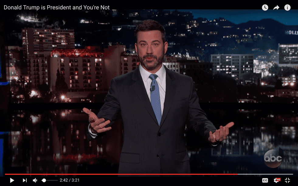 And so on, including a riff on Trump’s notoriously prevaricating and wacked-out Time interview this week, which he closed by observing sagely, “I’m president and you’re not.” Kimmel kills, so just click.