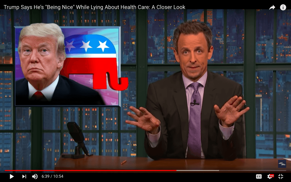 Seth moves briskly on to Trump’s fake “middle-class tax cut,” promised before November. Is the president so stupid that he doesn’t realize Congress isn’t in session? Or is he simply lying? He and the Republicans are now lying constantly about pre-existing conditions protection in health care, too.