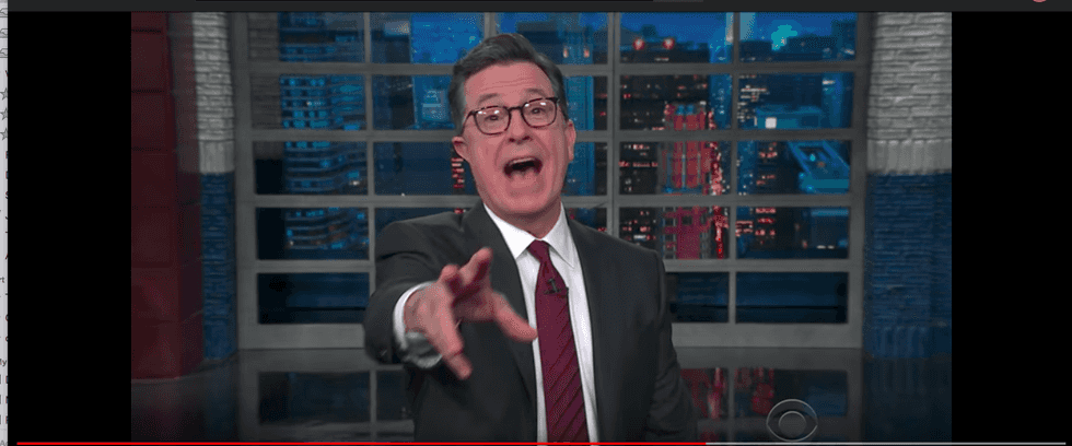 Stephen Colbert is keeping close watch on the Roy Moore scandal and its fallout. He’s amused by the spectacle of Rep. Mo Brooks (R-AL) scampering down a spiral staircase in the Capitol to avoid an inquisitive reporter.