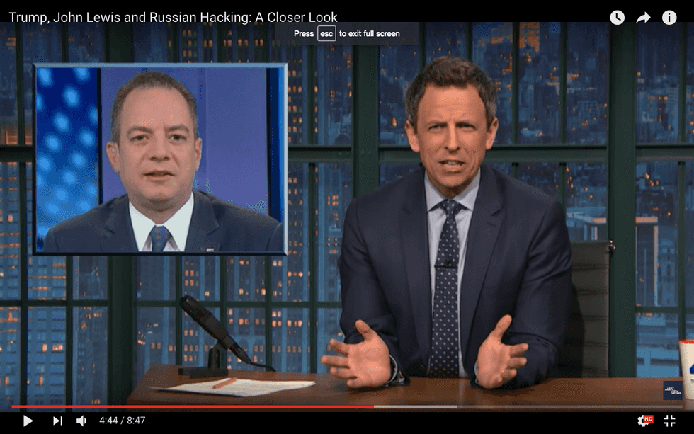 Seth Meyers is trying to keep score in the burgeoning feud between Donald Trump and Rep. John Lewis (D-GA), who will skip the inauguration because he questions the legitimacy of Trump’s election. As the Late Night host points out, to watch Trump disparage Lewis tells us more about his character than that of his target. But it tell us even more about the Republicans to hear them complain about Lewis — because, heaven forfend, they would never question a president’s legitimacy.