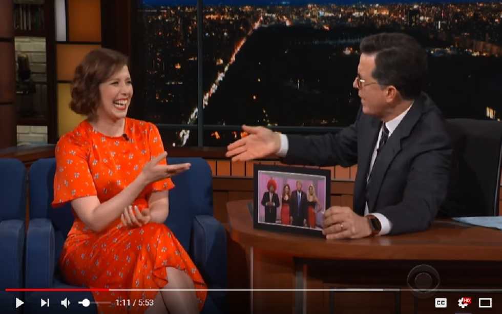 There are three noteworthy angles to this video clip of Vanessa Bayer speaking to late-night host Stephen Colbert. The first is Vanessa’s beautiful summer dress. It’s well worth pressing play to see the charming Ms. Bayer wearing it. The third is the discussion of Beyonce’s baby shower (starting about 3:00) at which Bayer was rumored to have made an appearance.