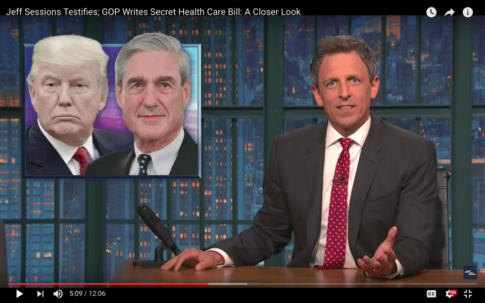 Seth Meyers tells us, in a tone of reasonable concern, that Donald Trump is watching cable news even more obsessively than usual — and demanding that Republican members of Congress appear more often on TV to defend him (a burden that few of them seem willing to shoulder). What obsesses the president, of course, is the Russia investigation. The latest rumor is that Trump has considered firing Robert Mueller, the special counsel in charge of that probe.
