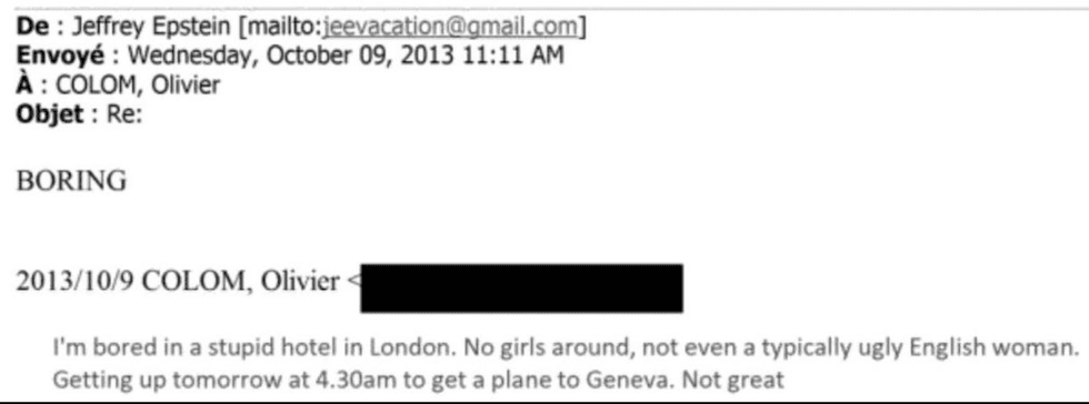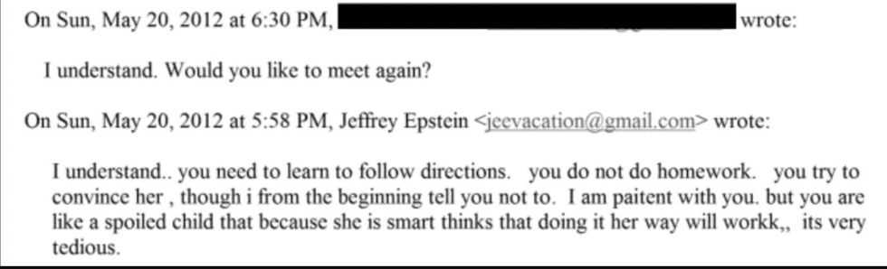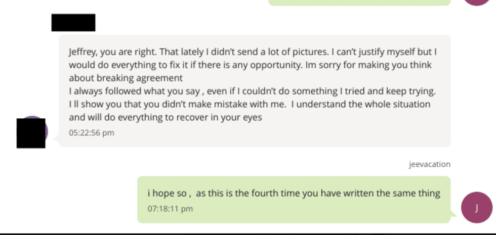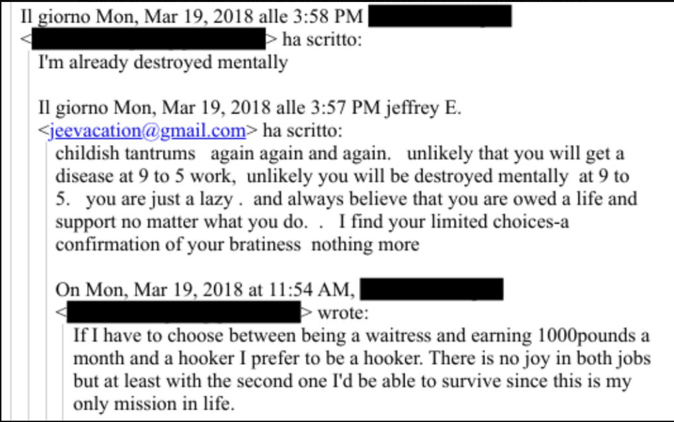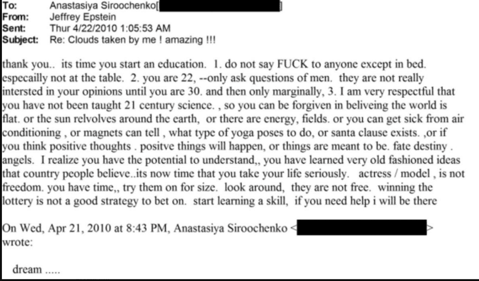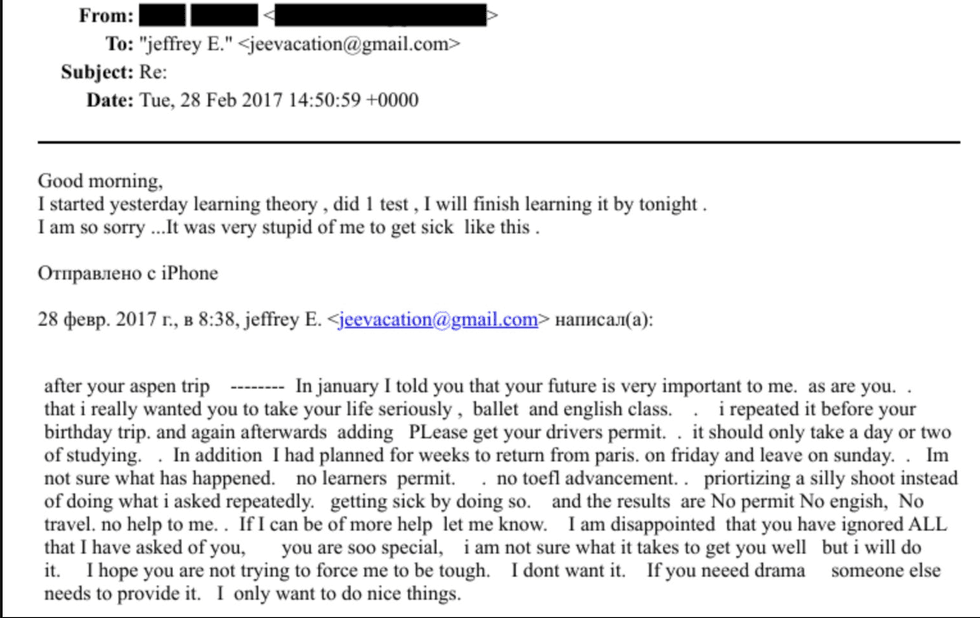 Epstein exercised a cruel pimp level of control over their most intimate concerns too, and sometimes issued veiled physical threats. In one exchange with an Eastern European newcomer, Jeff lectured her about how to treat her ovarian cysts, and then casually told her he didn’t want her to end up like his friend Ruslana Korshunova (also trafficked) who jumped out a window. He asks when her next period starts and tells her to take birth control. He finishes the conversation saying she should send him a sexy photo as a "thank you" and tells her it's "TIME TO GROW UP".