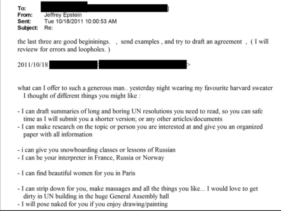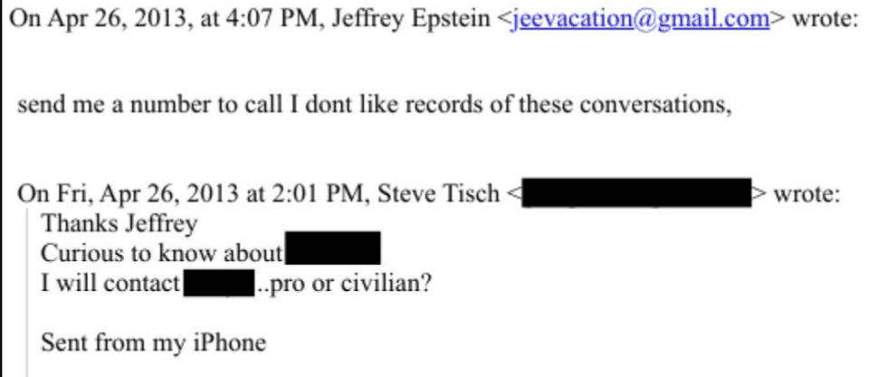There are many references in the post-2012 documents to agreements Epstein made with women, which seem in at least some instances to have been formal or quasi-legal. Some of Epstein’s women were in fact regarded as sex workers, as this exchange with his pal New York Giants owner Steve Tisch – asking whether an Epstein woman is “pro or civilian” – suggests. Epstein shot back telling him to discuss it by phone as “I dont [sic] like records of these conversations.”