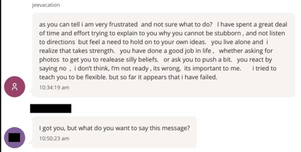 They were always failing to follow his directions, breaking promises, lying, making excuses, whining, immature, ungrateful, spoiled brats, etc. In one long text exchange, he berates a young woman as lazy, childish, stupid and tells her “my girls in New York” can take art classes. They get that privilege, he explains “as a RESULT of their dedication, truthfulness, and doing as they are told. you didn’t, dont. And continue to whine, so you have what you deserve [sic].”