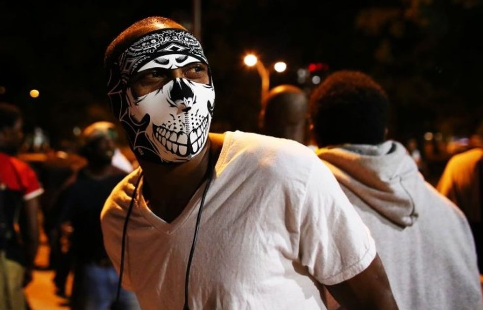 PHOTO: A masked protester walks in the streets downtown during another night of protests over the police shooting of Keith Scott in Charlotte, North Carolina, U.S. September 22, 2016. REUTERS/Mike Blake
