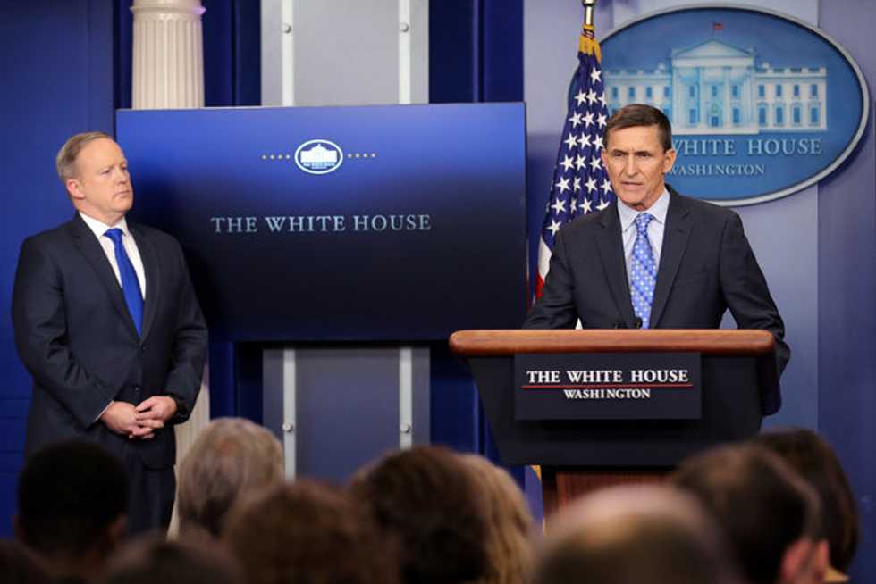 IMAGE: National security adviser General Michael Flynn (R) delivers a statement next to Press Secretary Sean Spicer during the daily briefing at the White House in Washington U.S., February 1, 2017. REUTERS/Carlos Barria