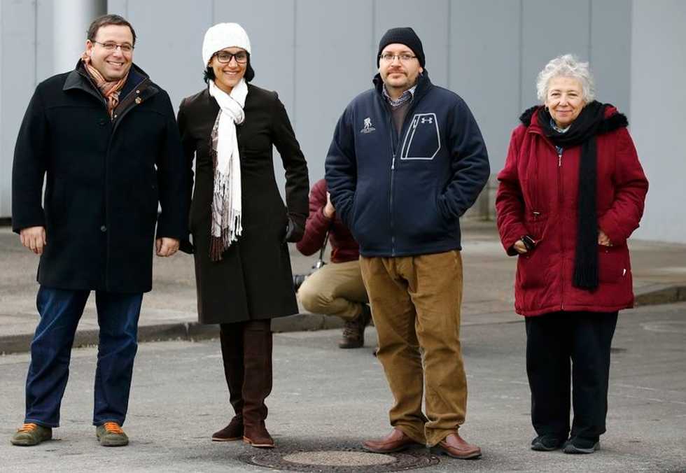 Photo: Jason Rezaian (2R), Washington Post reporter and one of the U.S. citizens recently released from detention in Iran, poses to media together with his wife Yeganeh Salehi (2L), mother Mary Rezaian (R) and brother Ali Rezaian (L) outside the Emergency Room of the Landstuhl Regional Medical Center (LRMC) in the southwestern town of Landstuhl, Germany, January 20, 2016. REUTERS/Kai Pfaffenbach