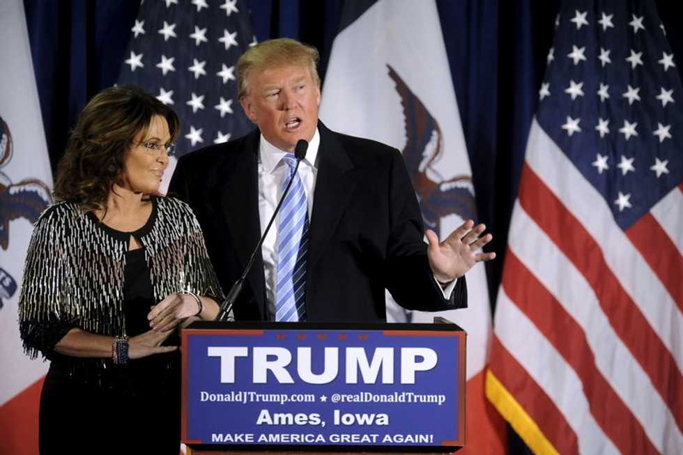 Photo: Donald Trump (R) thanks the crowd after receiving Former Alaska Gov. Sarah Palin’s endorsement at a rally at Iowa State University in Ames, Iowa January 19, 2016. REUTERS/Mark KauzlarichÂ