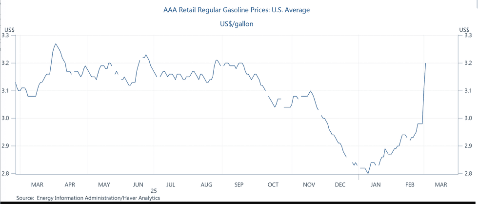 $3.20 a gallon—today’s national gas price—is not that high a price in historical terms. But it’s 40 cents higher than $2.80, where the pump price was a few months ago. A jump of the magnitude you see above is rare, and only happens when there’s some sort of supply shock. Fill up a 15-gallon tank twice a month and that's an extra $12, which isn’t game changing for anyone, but is noticeable.