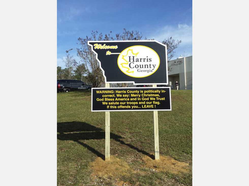 “WARNING: Harris County is politically incorrect,” reads the sign posted on Tuesday under a welcome banner and the official seal of the county, located in central Georgia near the border with Alabama.