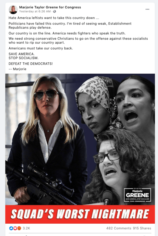 She posted text with the photo: "Hate America leftists want to take this country down … We need strong conservative Christians to go on the offense against these socialists who want to rip our country apart. … SAVE AMERICA. STOP SOCIALISM. DEFEAT THE DEMOCRATS!" As of 11:00 ET Friday morning, it was still up. Which is a whole other problem.